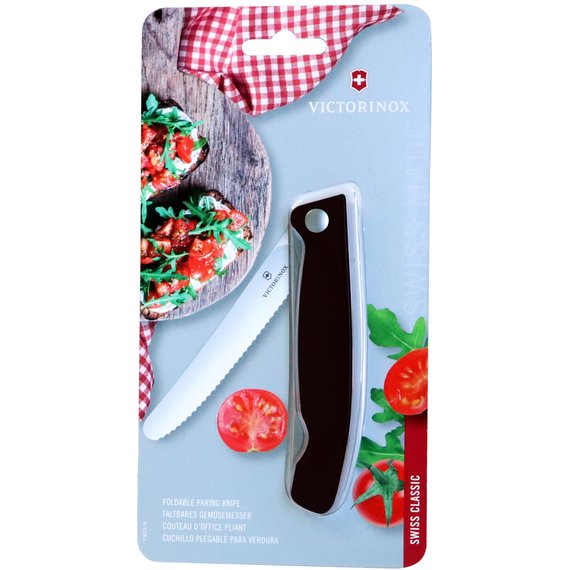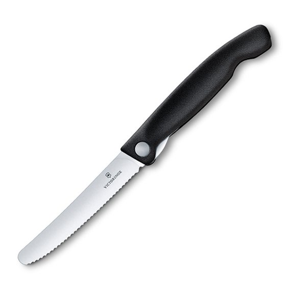 Legendaarisena pidetty sahalaitainen veitsi on saanut nousevaan retkeilytrendiin sopivan uuden muodon. Veitsi on taittuva sahalaitateräinen pikkujättiläinen, jolla leikkaat kaikki hedelmistä juureksiin ja jopa leipää. Terä lukkiintuu avonaisena, joten sillä on turvallista leikata. Taittuvan terän ansiosta veitsi menee pieneen tilaan, pysyy pakattuna suojassa ja pysyy pidempään terävänä. Terän pituus 11 cm. Veitsi on tarkoitettu kaikenlaisiin seikkailuihin, vaelluksiin, veneretkiin, asuntoautoon ja piknikille.Koko veitsen pituus avattuna 230 mm ja suljettuna 130 mm. Veitsi on konepesun kestävä. Yksittäispakkaus.