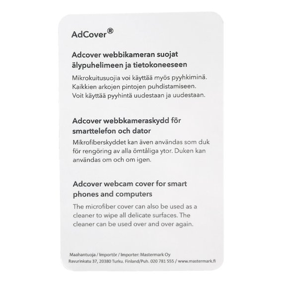 Kamerasuojat matkapuhelimeen ja tietokoneeseen. Pyöreä pienempi on matkapuhelinta varten (halkaisija 1cm). Neliskulmainen on tietokonetta varten. Kummatkin ovat mikrokuitukangasta. Kamerasuojat ja kortti ovat täysin kustomoitavissa omalla aineistolla. Minimitilaus on 500 kpl ja toimitusaika noin 4 viikkoa. Pyydä tarjous omasta toteutuksesta. Esimerkkihinta on 500