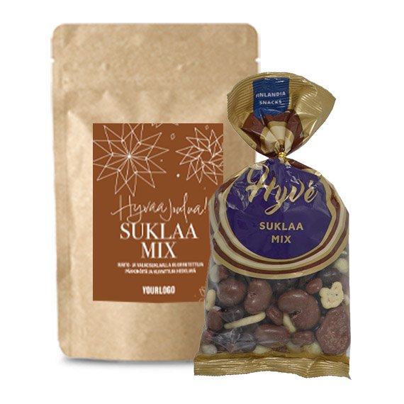 Sekoitus maito- ja valkosuklaalla sekä tummalla suklaalla kuorrutettuja pähkinöitä, rusinoita ja banaanilastuja. 250 g. Minimitilausmäärä 36 kpl. Hinta sisältää pussin, neliväripainetun etiketin ja pakkaustyön.