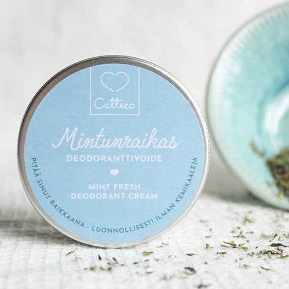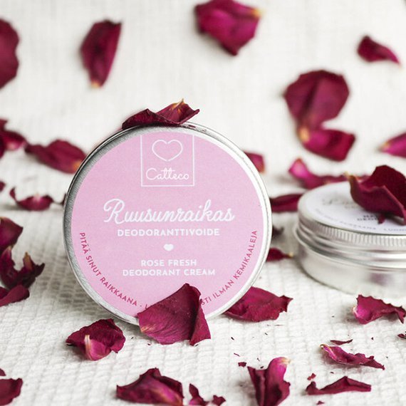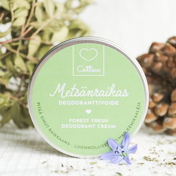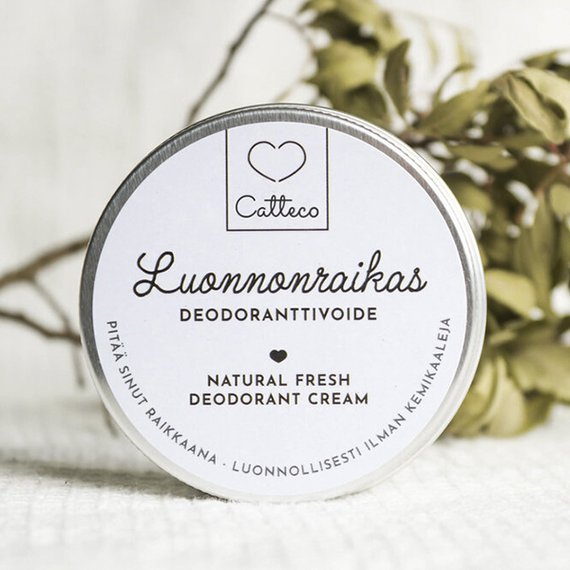 100% luonnollinen käsintehty deodoranttivoide ilman kemikaaleja tai alumiinia. Viisi erilaista vaihtoehtoa: sitrusraikas, ruusunraikas, mintunraikas, metsänraikas ja luonnonraikas.