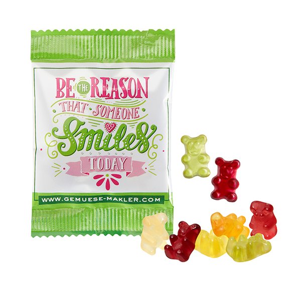 Vegaaninallet kompostoitavassa pussissa sisältävät 30% vähemmän sokeria. Makuina: appelsiini, omena, mango, päärynä, kirsikka ja mustaherukka. Säilyvyysaika 6 kk. Pussin koko noin 85 x 60 mm. Minimitilausmäärä 2500 kpl. Laatikossa 500 pussia. Hinnat sisältävät 1-5-väripainatuksen ja aloituskulut.