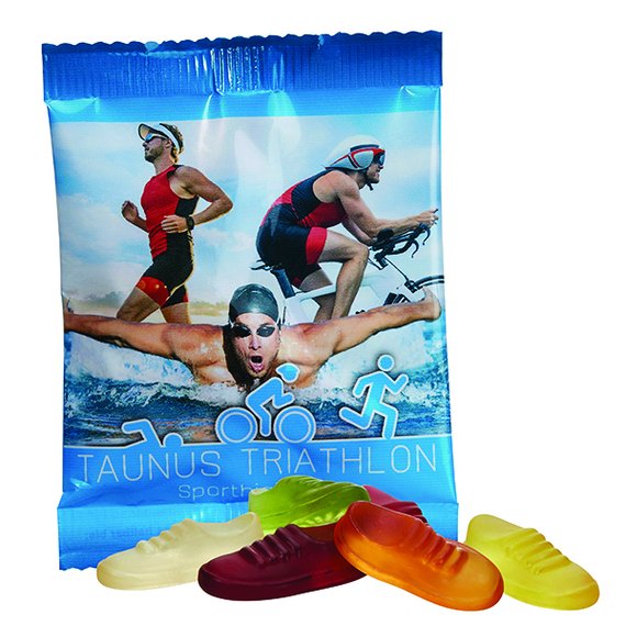 Hauskat hedelmäkumitossut ilahduttavat eri väreissä ja maistuvat ihanan hedelmäiseltä. Ei sisällä gelatiinia. Karkin maku ja väri tulevat kasviuutteista. Pakattu läpinäkyvään tai valkoiseen pussiin. Koko n. 100x75 mm, paino n. 20 g. Hinnat sis. 1-5-väripainatuksen ja aloituskulut.. Minimitilausmäärä 2400 kpl.