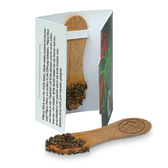 Koivusta valmistettu puulusikka, jonka päähän on kiinnitetty siemeniä. Ota tikku pois pakkauksesta , työnnä se maahan ja kastele. Tuote sisältää puisenlusikan, valitsemillasi siemenillä sekä kartonkisen ohjekortin. Lusikan koko 7 x 1,5 cm kortin koko 5,5 x 8 cm. Paino 5 g. Arvioitu toimitusaika n. 4-5 viikkoa. Saatavilla olevat siemenvaihtoehdot: Kesäkukkasekoitus, päivänkakkara, krassi, basilika ja lemmikki.