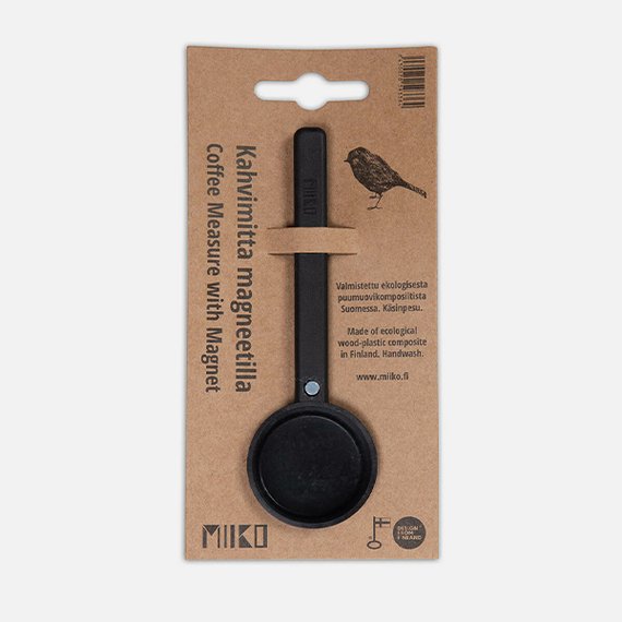 Kahvimitta on valmistettu ekologisesta, elintarvikkeille sopivasta puumuovikomposiitista Suomessa. Kahvimitan tilavuus on 17 ml. Varressa olevalla magneetilla kiinnität mitan kätevästi metalliseen suodatinpussitelineeseen tai kahvin säilytysrasiaan. Tässä kahvimitassa erityistä on tyylikäs muotoilu ja erinomainen käytettävyys.