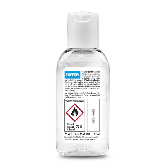 Antiseptinen Safegel käsigeeli on käsien desinfiointiin tarkoitettu valmiste. Desinfioivana aineena etanoli (70 p-%), joka desinfioi tehokkaasti ja haihtuu nopeasti. Sisältää glyserolia ja PEG-7 glyseryylikokoaattia, joiden ansiosta tuote ylläpitää ihon kosteustasapainoa eikä kuivata käsiä. pH n. 7,5.