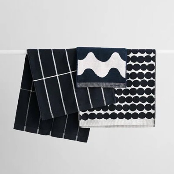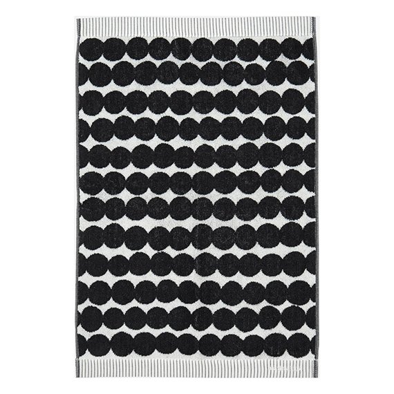 Luomupuuvillafroteesta valmistettu käsipyyhe Maija Louekarin suunnittelemalla Räsymatto-kuosilla. Oikean ja nurjan puolen värit ovat toistensa vastakohdat. Koko 50 x 70 cm.