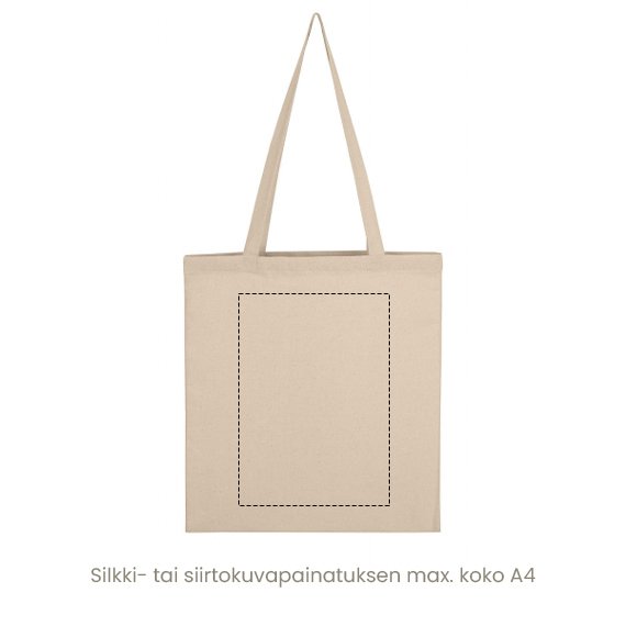 Laadukkaalla puuvillakassilla on todellista hyötyarvoa. Kannat siinä painavammatkin ostokset, eväät tai varusteet. Kahvojen kiinnityskohtien ristiompeleet tekevät kassista vakaan. Kunnon 70 cm pitkät kahvat yltävät olalle tai reilusti ranteen ympärille. Kassin sivuihin ommellut saumat estävät kassia kutistumasta. Kassi on 100 % luomupuuvillaa, 140 g/m2. Mitat 38 x 42 cm. Loistavaa tilaa haluamallesi painatukselle!