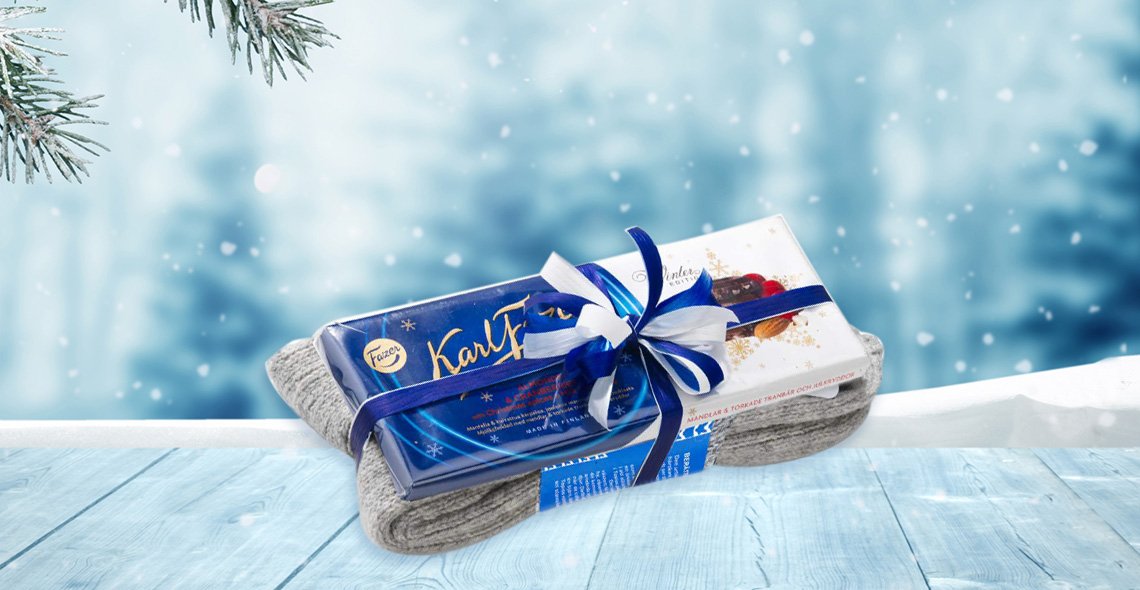 Pehmeät Tapio-villasukat, suomalaista suklaata, hyvä kirja ja takan lämpö. Mikä nautinnollinen tapa viettää syysilta omalla kotisohvalla. Fazerin sininen on kaikkien rakastama klassinen kotimainen herkku. Villasukat ovat miellyttävää villasekoitetta.