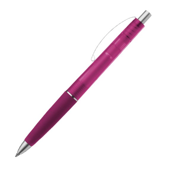 Huurrettu pintainen kuulakärkikynä, jossa kuminen pidinosa ja kaareva metalli klipsi. Kynässä on hopeiset yksityiskohdat ja sininen muste. Hinnat sisältävät 1-väripainatuksen kynään aloituskuluineen.