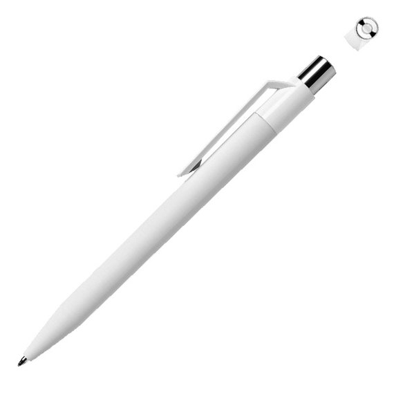 Minimalistisesti muotoiltu kumipintainen Dot-kynä on pirteä kumppani palaverissa ja päivän kiireissä. Kompaktin ABS-muovirunkoisen kynän juju on sen yksityiskohdissa, kuten painonapissa toistuvat kynän väri. Leveä klipsi pitää kynän paikallaan, ja jumbo-säiliöstä riittää pitkään mustetta. Musteen väri sininen.