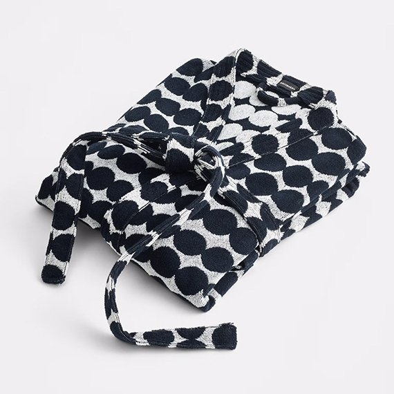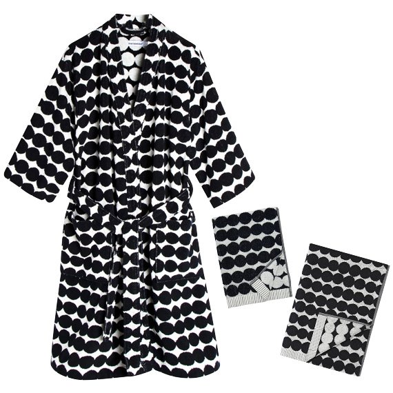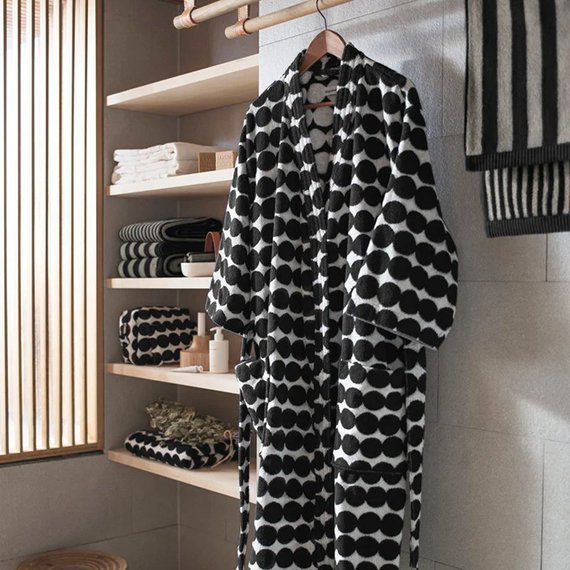 Räsymatto-kylpytakki on valmistettu pehmeästä 100 % puuvillafroteesta. Tätä paksua ja mukavaa puuvillafroteesta valmistettua kylpytakkia koristaa mustavalkoinen Räsymatto-kuosi. Kylpytakissa on suuret taskut edessä ja irrotettava vyö. Takin sisäpuoli on väriltään negatiivi ulkopuolesta, antaen kylpytakille hauskan ilmeen. Väri mustavalkoinen.