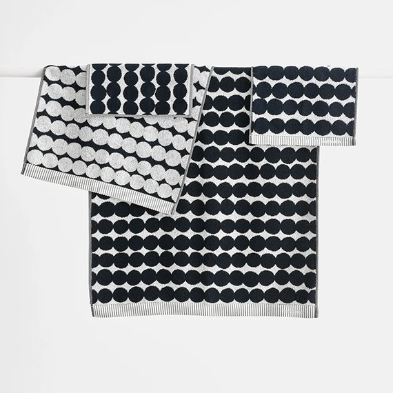 Pehmeät Räsymatto-pyyhkeet on valmistettu 100 % luomupuuvillafroteesta. Setti sisältää kaksi pyyhettä: kylpypyyhkeen koossa 150 x 75 cm ja käsipyyhkeen koossa 50 x 70 cm. Pyyhkeiden väri on myös mustavalkoinen.