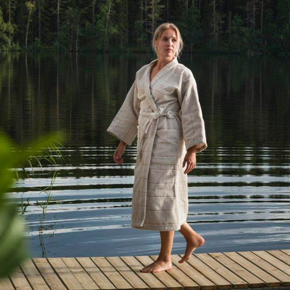 Laituri-sarjan pellavafroteinen kylpytakki – pellavan karheutta ja imukykyä parhaimmillaan. Malli on unisex, joten sama malli sopii sekä miehille että naisille. Kylpytakki toimitetaan tyylikkäässä lahjarasiassa. Lisäpalveluna voimme nimikoida takin, jolloin lahjasta tulee entistä henkilökohtaisempi lahjansaajalle. Brodeeraus tulee takin vasempaan rintaan, sydämen kohdalle.