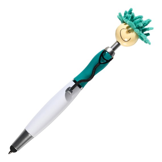 Leveästi hymyilevä MopToppers-kynä kirjoittaa napakasti ja piristää työpöytää. Kynähahmon mikrokuituhiuksilla voit puhdistaa nopeasti esimerkiksi puhelimen tai tabletin näytön. Kynän kärjessä on näppärä kosketusnäyttöpää.