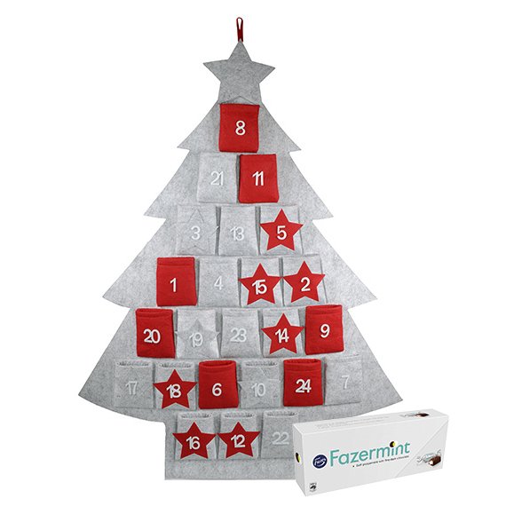 Laskekaa päivät jouluun kuusen muotoisen huopakalenterin ja herkullisten Fazermint-konvehtien avulla. Täytä taskut suklaalla ja tee jokaisesta joulukuun päivästä pieni juhlahetki.