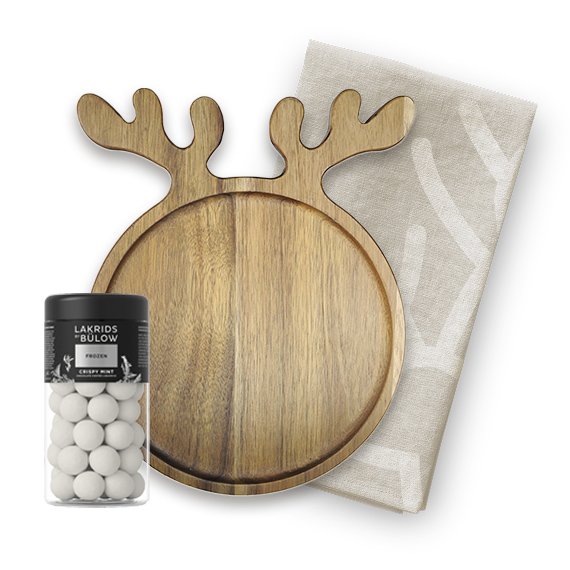 Lahjasetti yhdistää rustiikkisen estetiikan ja hienostuneen herkuttelun: tarjoilualusta poronsarvikahvoilla ja hillitysti kuvioitu keittiöpyyhe luovat tunnelmaa kattauspöytään. Setin täydentää Lakrids by Bülowin lakritsit.