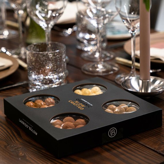 Slow crafted selection box on ihanteellinen, kun haluat antaa lahjaksi tyylikkään sekoituksen hienostuneita luomumakeisia. Sekoitus sisältää neljää eri makua: Mango vanilla, Caramel date, Dark truffle ja Anniversary. Lakritsit valmistetaan Tanskassa gluteenittomasta riisijauhosta.