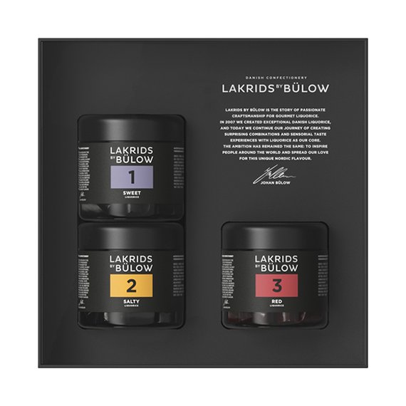 Kolme klassikkoa kokoontuu! Rasiassa kolmea klassista lakritsimakua: suolaista, makeaa sekä amerikkalaisempaan makuun: marjaisaa Red-lakritsia. Lakrids by Bülow makeiset ovat korkealaatuisia ja hienostuneita makeisia sekä suklaakuorrutettuja lakritseja.