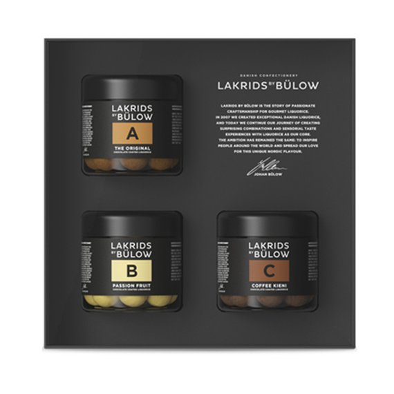 Kolme makua kerralla! Setissä on mukana rasia Classic -makua, eli maukasta suklaamakeista lakritsisydämellä, ja lisäksi kaksi rasiaa lakritsia, jossa toinen on valkosuklaalla ja passionhedelmällä kuorrutettua ja toinen kahvilla ja maitosuklaalla kuorrutettua. Lakrids by Bülow makeiset ovat korkealaatuisia ja hienostuneita, suklaakuorrutettuja lakritseja.