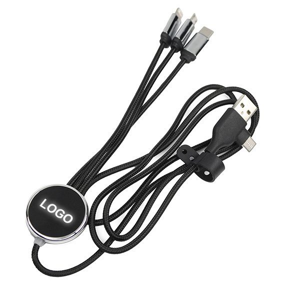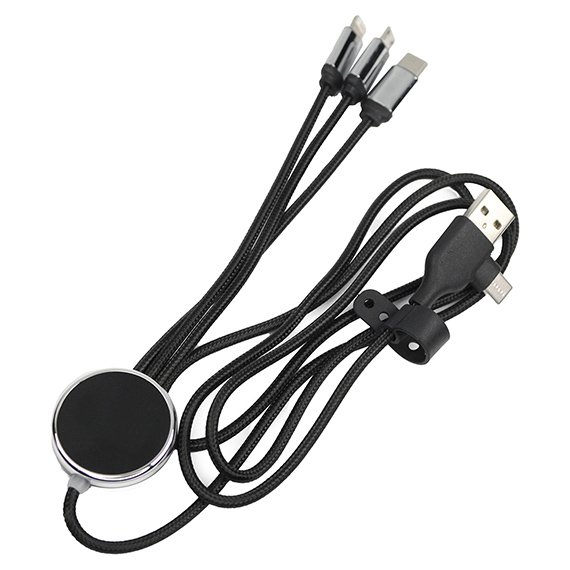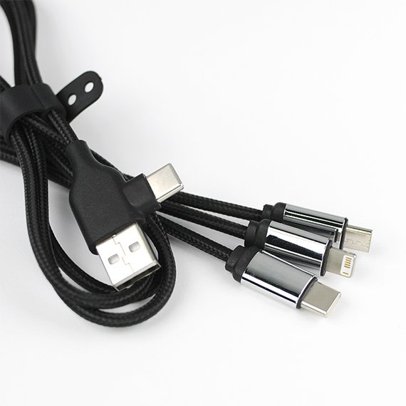 Käytännöllinen 4 in 1 latauskaapeli. Piuhojen liittymäkohdassa on erinomainen paikka logolle – kaiverruskohtaan osuva LED-valo heijastaa logon näyttävästi. Sisältää seuraavat latauspäät: USB+Type-C 2in1, Micro-USB, Type C, Lightning. Kaapelin kokonaispituus 120 cm.