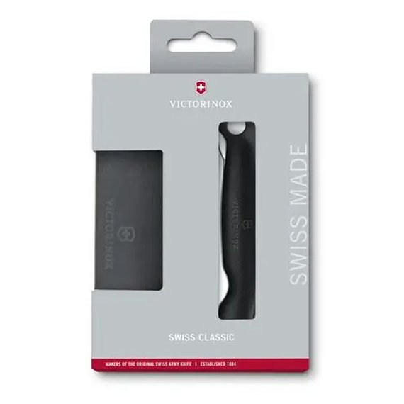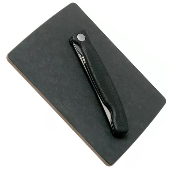 Sveitsiläinen klassikko. Setti, jossa kokoontaitettava hedelmäveitsi ja leikkuulauta. Terä taittuu kahvan sisään, jolloin se pysyy hyvässä kunnossa, eikä aiheuta vahinkoa. Musta polypropeenista tehty kahva. Terän pituus on 11 cm ja siinä on aaltomainen reuna. Veitsi on konepesun kestävä. Leikkuulauta on ympäristöystävällinen, eikä se vahingoita terää. Leikkuulaudan koko 16,8 x 12,2 x 0,6 cm. Laudan ja veitsen yhteispaino 186 g.