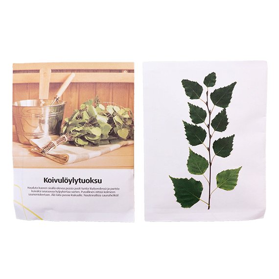 Pussin sisällä suodatinpussi, jossa kotimaista koivunlehtirouhetta. Laita pussi hautumaan lämpimään löylyveteen noin 30 minuuttia ennen saunomista. Laita pussi kuivumaan käytön jälkeen. Pussista riittää koivuntuoksua 3-5 saunomiskertaan. Kotimainen tuote.