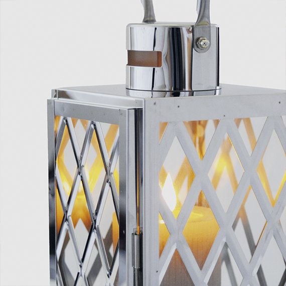 Hopean värinen ruostumattomasta teräksestä valmistettu metallilyhty kahvalla. Luo satumainen tunnelma turvallisesti sisä- ja ulkotiloissa kynttilän tai LED-valojen avulla. Mitat 13 x 12 x 28,5 cm. Tuote toimitetaan lahjapakkauksessa.