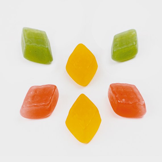Ainesosat: sokeri, glukoosi-fruktoosisiirappi, muunnettu perunatärkkelys, glukoosisiirappi, vesi, liivate, happamuudensäätöaineet (E330, E331), kosteudensäilyttäjä (E420), aromit, värit (E120, E160a, E141), pintakäsittelyaine (E903).