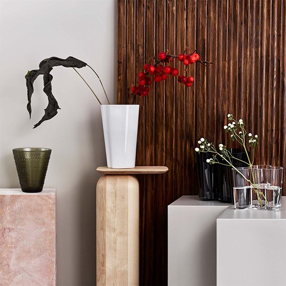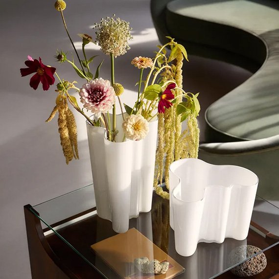 Alvar Aalto yhdisti selkeän modernin muotoilun ja käsityöläisten erikoisosaamisen luodessaan klassisia sisustusesineitä, joissa funktionaalisuus yhdistyy veistokselliseen muotoon. Suomalaisen luonnon vaikutus näkyy Alvar Aallon luomassa epäsymmetrisessä aallon muodossa, jolla Aalto voitti vuoden 1937 Pariisin maailmannäyttelyyn liittyvän suunnittelukilpailun. Siitä on tullut yksi modernin pohjoismaisen muotoilun ajattomista klassikoista. Jokainen Aalto-maljakko valmistetaan yksittäin Iittalan lasitehtaalla monivaiheisessa valmistusprosessissa. Lasimaljakko saa alkunsa suupuhalluksella, minkä jälkeen se katkaistaan lasimassasta käsin ja hiotaan lopulliseen muotoonsa. Pitkävartiset kukat pääsevät oikeuksiinsa korkeassa maljakossa. Valkoisesta lasista valmistettu maljakko on monikäyttöinen ja veistoksellinen sisustuselementti. Mitta 220 mm. Vain käsinpesu.