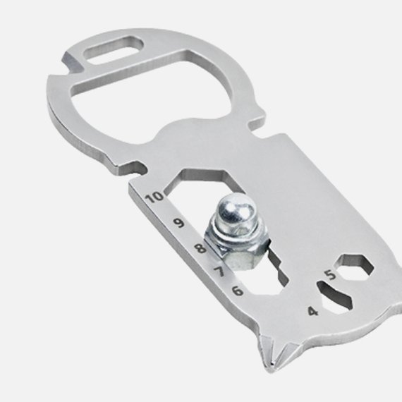 Pieni ja kompakti monitoimityökalu, joka on valmistettu korkealaatuisesta mattapintaisesta ruostumattomasta teräksestä. Tarpeellinen kumppani, joka sopii jokaisen avainnippuun. Yhteensä 16 eri toimintoa: kannennostin, pieni ja iso litteäkärkinen ruuvimeisseli, ristipääruuvimeisseli, kaapelinpoistaja, kaksi puoliavainta, seitsemän kuusikulmaista kantaa, viivain ja naulanvedin. Hinnat sisältävät logokaiverruksen työkaluun sekä pakkauksen omalla designilla.