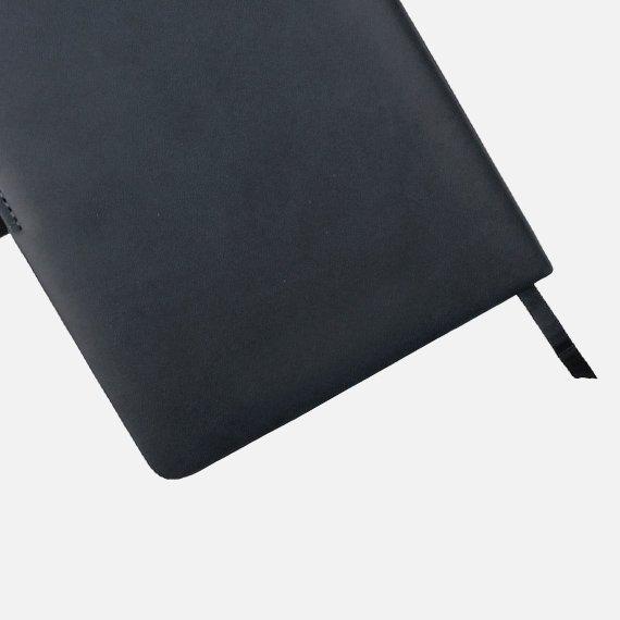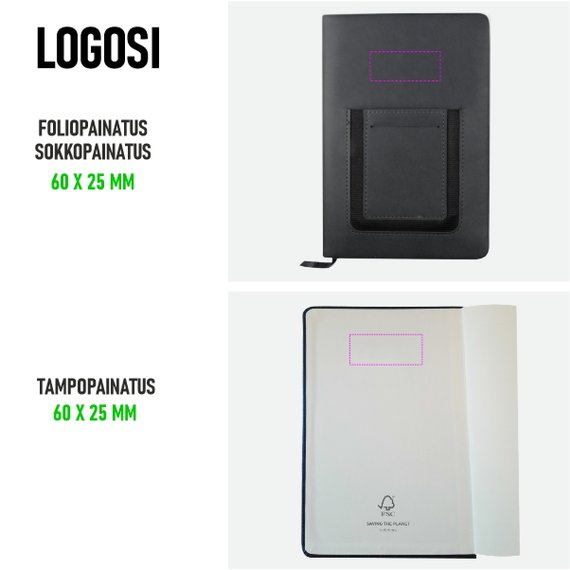 Tyynymäinen PU-kantinen 14,5 x 21 cm kokoinen muistikirja joustavalla etutaskulla. Muistikirjassa 80 sivun verran valmiiksi viivoitettua tilaa muistiinpanoille, pyöristetyt kulmat sekä kirjanmerkki. Paperi 80 g/m². Materiaali kierrätetty PU, paperi FSC-sertifioitua.