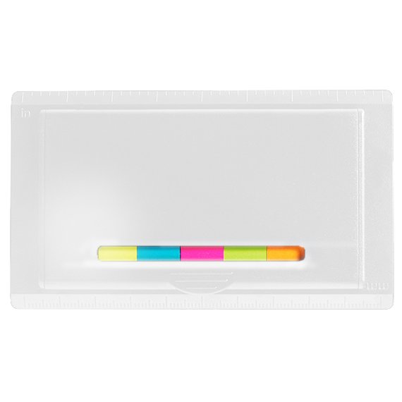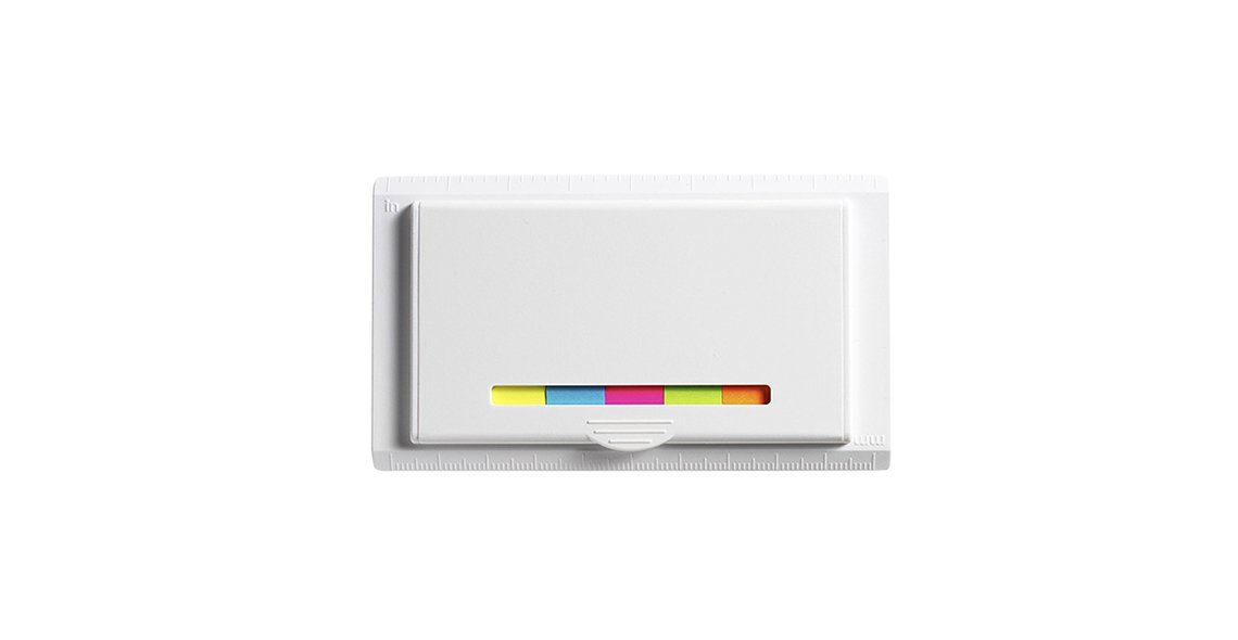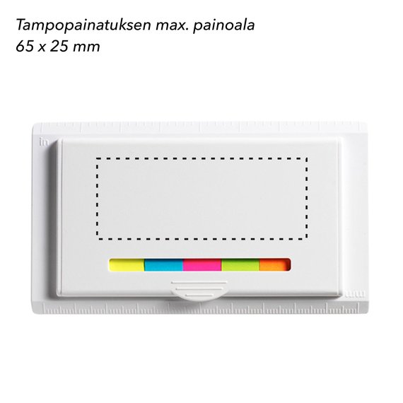 Kannellisessa kotelossa on runsaasti muistilappuja seitsemässä eri värissä. Kotelon sivuja voi käyttää viivoittimena, ja niissä on sentti- ja tuumamerkinnät. Kotelon koko on 10,8 x 6,2 cm, väri valkoinen.