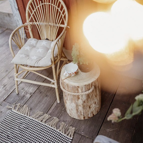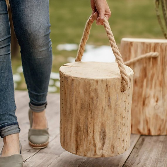 Käsintehty ainutlaatuinen design kaluste on valmistettu puusta ja hamppuköydestä. Kun käytät Pölkkyjä ulkona, suosittelemme ylä- ja alapintojen käsittelemista puuöljyllä tai lakalla. Huomaa, että tuotteen luonnollisten ominaisuuksien vuoksi sen halkaisija voi vaihdella. Kuvat ovat viitteellisiä, sillä jokainen pölkky on uniikki. Korkeus 45 cm.