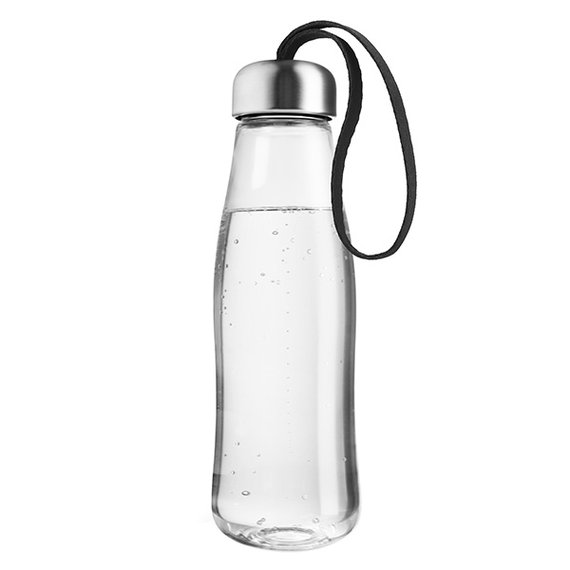 Tyylikäs Eva Solon musta juomapullo on 100 % vedenpitävä, joten sen voi huoletta sujauttaa laukkuun pelkäämättä sen vuotamista. Kätevän nauhan ansiosta pulloa on helppo kantaa mukana. Pullon materiaali on kestävää borosilikaattilasia, korkki harjattua ruostumatonta terästä. Ei sisällä BPA:ta, ftalaatteja tai lyijyä. Lasipullo kestää konepesun, mutta korkki tulee pestä käsin. Korkeus 225 mm, halkaisija 7 cm, paino 0,23 kg.