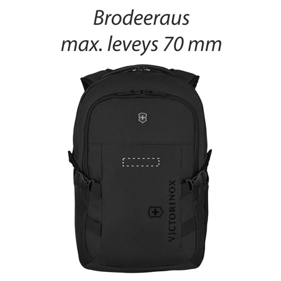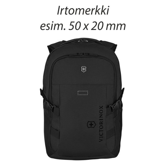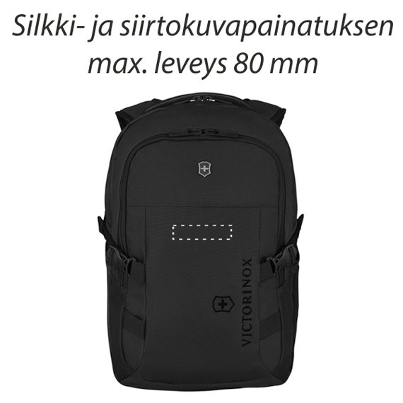 Tyylikkäänä reissuun. Sporttinen ja kestävä musta reppu on tehty polyesterista ja sitä koristaa tyylikäs Victorinoxin risti ja kilpi. Reppu on kuin luotu matkustamiseen, sillä siinä on läpimentävä tasku, jonka avulla sen saa kätevästi kiinnitettyä matkalaukun vetokahvaan. Selässä ja sädettävissä olkahihnoissa olevien toppausten vuoksi reppua on mukava kantaa selässä. Repun etutaskussa on kätevät lokerot esimerkiksi passille ja puhelimelle. Tilavuus 20 L. Koko 7,1 x 31 x 45 cm, paino 0,7 kg. Sopii enintään 15-tuumaisille kannettaville tietokoneille.