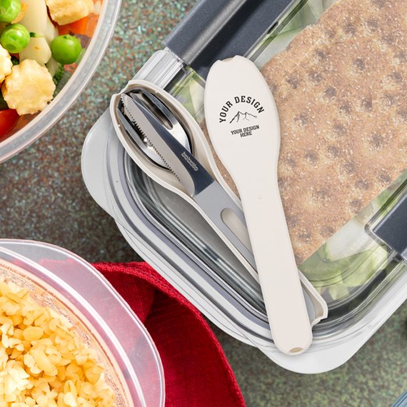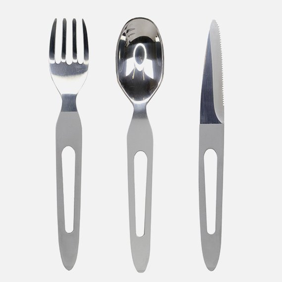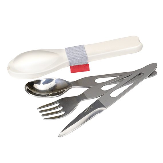 Kolmen kappaleen ruokailuvälinesetti mahtuu niin taskuun kuin reppuun. Mukana haarukka, veitsi ja lusikka, jotka säilytetään muotoilussa muovirasiassa. Aterimet valmistettu ruostumattomasta teräksestä.