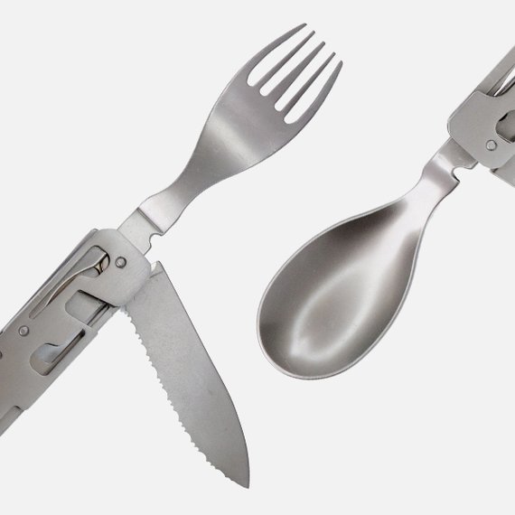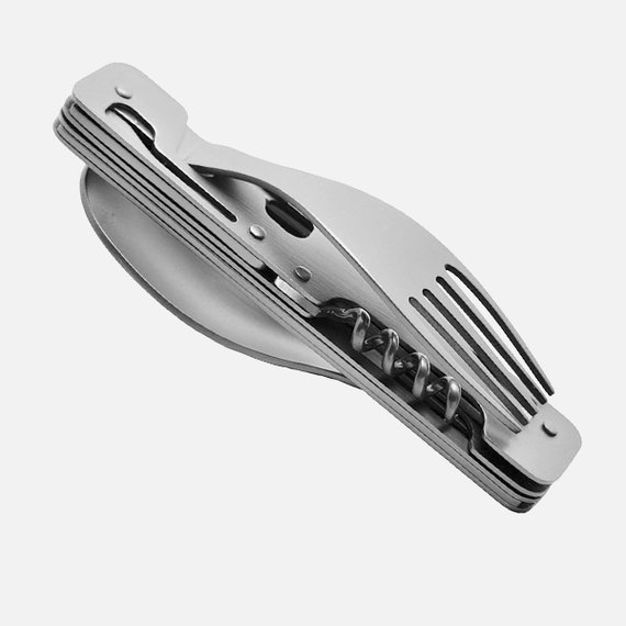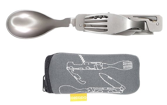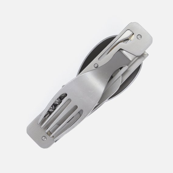 Kätevät ruokailuvälineet, jotka mahtuvat fiksun taitto-ominaisuutensa ansiosta pienempäänkin reppuun. Settiin kuuluu haarukka, veitsi, lusikka, viinipullonavaaja sekä kansi –ja pullonavaaja. Valmistettu ruostumattomasta teräksestä ja päällystetty titaanilla. Mukana vetoketjullinen säilytyspussi.