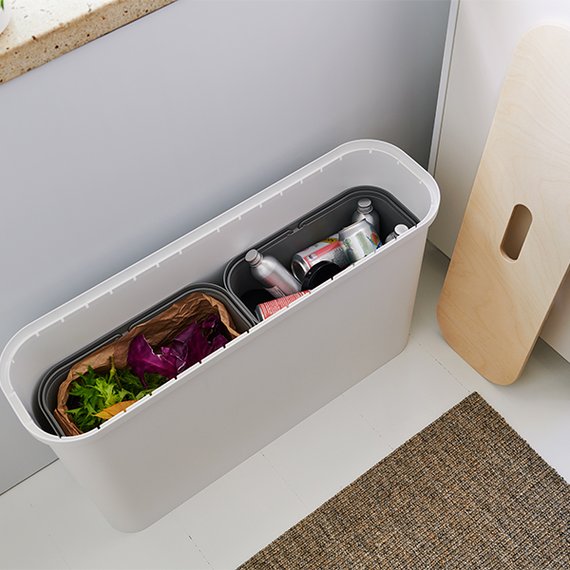 Pohjoismaista muotoilua edustava kestävä säilytysratkaisu arjen tarpeisiin. Modulaarinen konsepti tekee lajittelusta ja kierrättämisestä helppoa ja vaivatonta. Collect 46 L Slim on suunniteltu erityisesti ahtaisiin tiloihin, kuten sisäänkäynteihin ja eteisiin. Jätteet erotellaan helposti toisistaan kahden 13 L sisäosan avulla. Kaunis puinen kansi viimeistelee tuotteen. Valmistettu lujasta ja pitkäaikaisesta kierrätysmuovista. Mitat 21,5 x 72,2 x 42 cm.