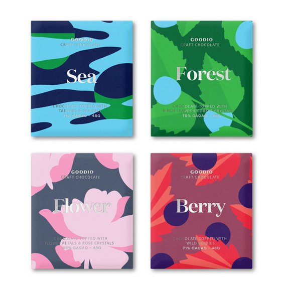 Herkuttele suomalaisella, käsintehdyllä suklaalla. Goodio-suklaa on valmistettu parhaista, pääosin luomulaatuisista ja osin villeistä raaka-aineista. Suklaa ei sisällä lisäaineita tai valkoista sokeria. Gluteeniton ja soijaton tuote sopii myös vegaaneille. Tuotteilla on Avainlippu- ja Design from Finland-merkit.
