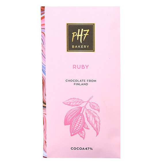 Kotimaisen PH7-konditorian kotimaisista raaka-aineista tehdyt suklaalevyt ovat makea lahja. Maista ja ihastu kauniin vaaleanpunaiseen rubiinisuklaaseen. Rubiinisuklaa on valmistettu ilman väriaineita ja aromeja. Marjaisa makumaailma on ominainen ruby-suklaalle. Kaakaopitoisuus 47%. Paino 100 g.