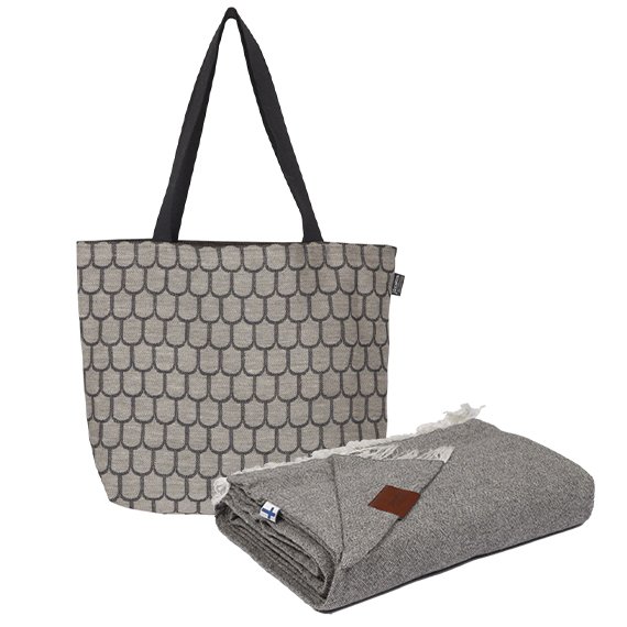 Kaunis Jokipiin Pellavan setti sisältää Graniitti torkkupeiton harmaana ja Jugend ostoskassin valkoisena/tummanharmaana. Kassin on suunnitellut Vappu Pimiä. Tuotteet tulevat lahjapakkauksessa.