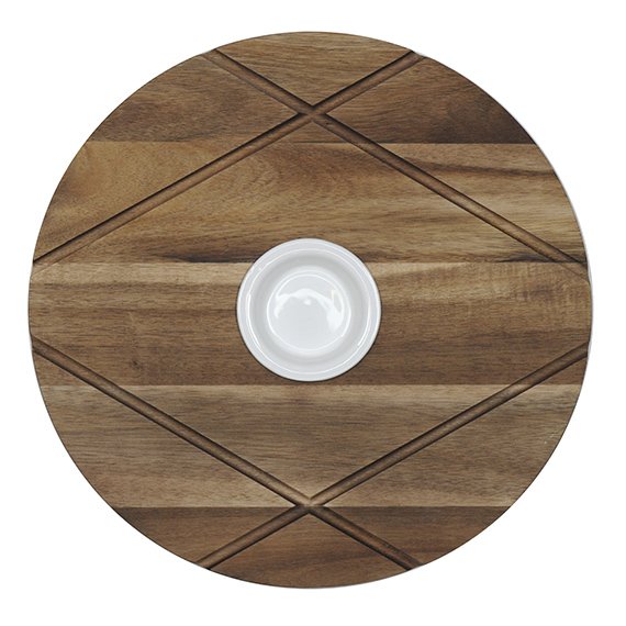 Tuote on valmistettu FSC-sertifioidusta akaasiapuusta ja jokaisen tuotteen puukuviossa sekä sävyssä on luontaista yksilöllistä vivahteikkuutta - aivan kuin käsin tehdyssä ruisleivässä. Öljytty rapsiöljyllä. Halkaisija 35 cm, korkeus 2,5 cm.