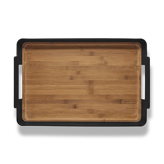Eva Solon upealla ja reilunkokoisella tarjottimella kannat vakaasti kupit ja kannut. Korkeat reunat estävät tavaroita liukumasta tarjottimen päältä ja sivuilla olevista kahvoista saa hyvän otteen. Tarjotin on helppo puhdistaa kostealla liinalla. Bambua suositellaan öljyämään säännöllisesti. Materiaali: muovi, FSC-sertifioitu bambu. Koko 50 x 35 cm, korkeus 6 cm.