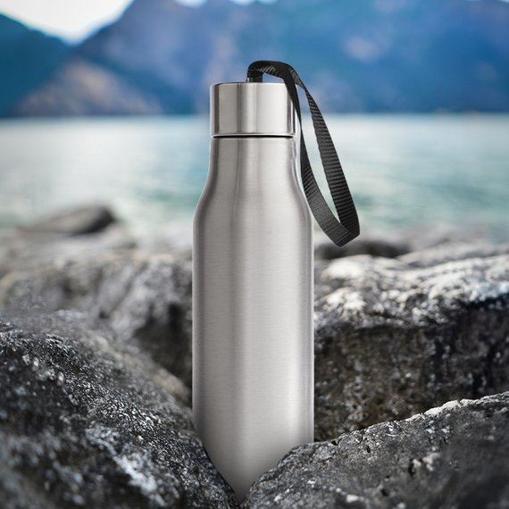 Ruostumattomasta teräksestä valmistettu termospullo kulkee helposti mukana kantolenkin avulla. Tuplaseinärakenteensa avulla pullo pitää lämpimät juomat lämpimänä ja kylmät kylminä. Mustan kantolenkin avulla pullo on helppo kantaa ranteen ympärillä tai laittaa kuntopyörän tangolle roikkumaan.