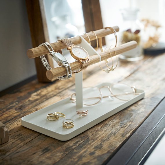 Tosca-sarjan koru- ja kelloteline sopii täydellisesti monenlaisten pienten asusteiden säilytykseen. Erityisesti kellot ja rannekorut asettuvat kauniisti ja käytännöllisesti telineen saarnipuisille tangoille. Alaosan tarjotin puolestaan sopii hyvin esimerkiksi silmälasien ja sormusten säilytykseen. Suunniteltu Japanissa.