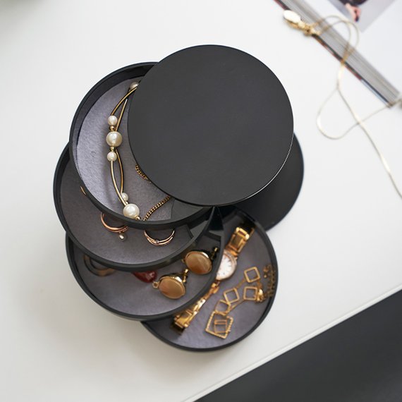 Minimalistisessa Tower-korulippaassa on neljä kerrosta, joissa korut ja muut pikkutavarat on vaivaton pitää hyvässä järjestyksessa. Kannen ansiosta myös ylin kerros on suojassa pölyltä. Suunniteltu Japanissa.