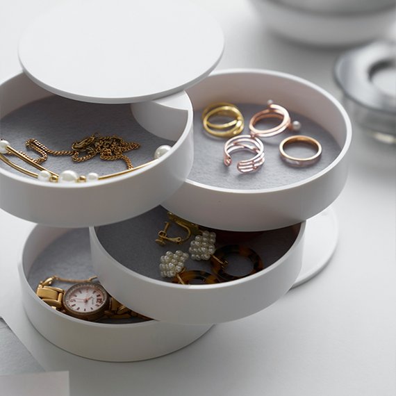 Minimalistisessa Tower-korulippaassa on neljä kerrosta, joissa korut ja muut pikkutavarat on vaivaton pitää hyvässä järjestyksessä. Kannen ansiosta myös ylin kerros on suojassa pölyltä. Suunniteltu Japanissa.