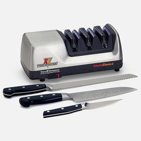 ”Jos sinulla on kokoelma arvokkaita veitsiä, niin tämä on sinun teroittimesi. Trizor XV:ssä on kolme teroitusvaihetta, jotka muodostavat veitseen tasaisen, uskomattoman terävän terän. Veitsi leikkaa vaivattomasti kypsät tomaatit ja pysyy terävänä kauemmin kuin muilla välineillä teroitettaessa”