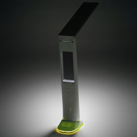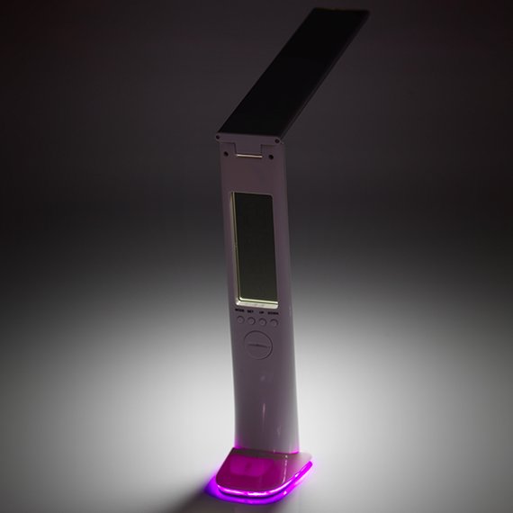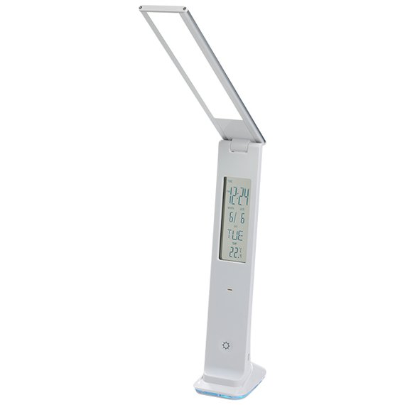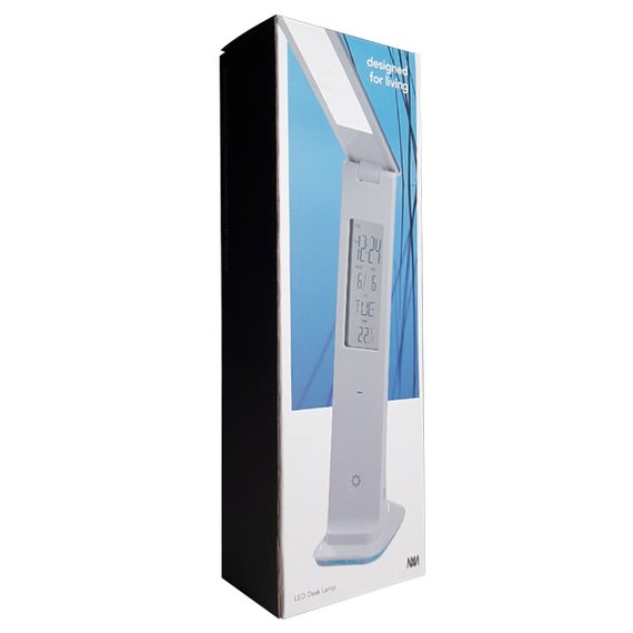 Lukulamppu taitteella! Tyylikkäässä lukulampussa yhdistyvät kello, kalenteri, lämpömittari ja yövalo vaihtuvalla värillä. Saat säädettyä lukuvalon kolmeen eri voimakkuuteen: 15 %, 50 % ja 100 %. Kalenteri, kello ja lämpömittari ovat tyylikkäästi läpinäkyvässä mattalasissa. Lukuvalon voi taittaa peittämään kello-osan. Lukulampun päällinen on harjattua alumiinia. Koskettamalla lampun jalkaa kerran syttyy jalassa LED-yövalo, joka vaihtaa väriään. Kaksi kertaa koskettamalla valo pysyy punaisena. Punainen valo ei häiritse silmän yönäköä. Lampun koko 95 x 65 x 460 mm. Lamppu toimii ladattavalla akulla ja näyttö erillisellä nappiparistolla. Saat sen toimimaan missä vain. Latausaika 2-6 tuntia. Mukana paristo ja latauskaapeli USB-liittimellä.