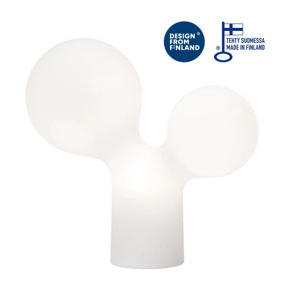 Polyeteenistä valmistettu näyttävä pöytävalaisin on suomalaista designia parhaillaan. Valaisin on varustettu energiatehokkailla, vaihdettavilla LED-valonlähteillä, ja sen kupu on valmistettu täysin kierrätettävästä materiaalista. Suunniteltu ja valmisteltu Suomessa. Suunnittelija: Eero Aarnio. Mitat: 580 x 530 x 280 mm. Paino 3 kg.